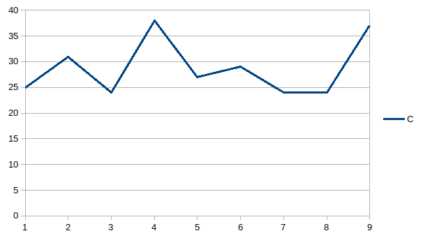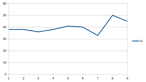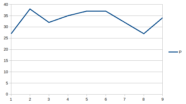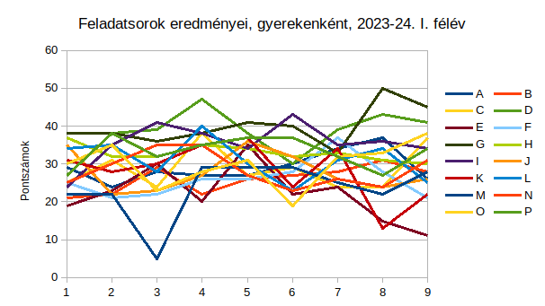 Kezdjük egy sűrű de nem bonyolult grafikonnal. Az egyes színek egyes gyerekeket jelölnek, az értékeik pedig azoknak a feladatsoroknak a pontjait, amit minden 8.-os gyerkőcöm megírt. (Nyilván többet is írtak, de azok nem összevethetőek, most itt nem részletezem miért, de valamikor majd leírom.)