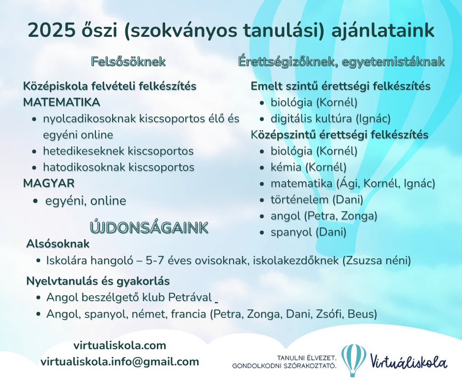 • középiskolai felvételire hangoló és felkészítés egyéni online és kiscsoportos, idén 6., 7. és 8. osztályosoknak is